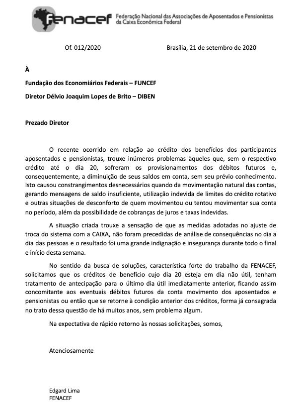 A FENACEF encaminhou hoje, à FUNCEF, ofício sobre as dificuldades ocorridas com o crédito dos benefícios dos participantes aposentados e pensionistas, ocorridas nessa semana de setembro. A Federação deu ciência dos transtornos que afetaram o dia a dia de todos e apresentou propostas de solução para a questão.