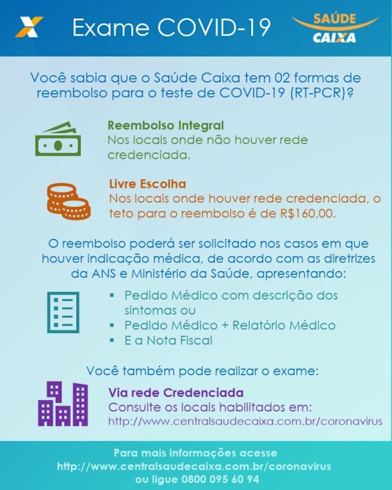O Plano Saúde Caixa está reembolsando gastos com o exame da COVID-19. Veja as informações na imagem abaixo.